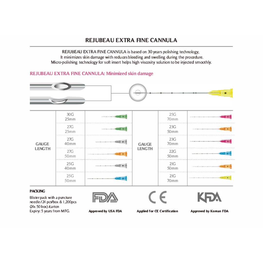 REJUBEAU EXTRA FINE CA NNULA is based on 30 years polishing technology, It minimizes skin damage with reduces bleeding and swelling during the procedure. Micro-polishing technology for soft insert helps high viscosity solution to be injected smoothly.